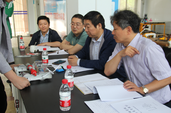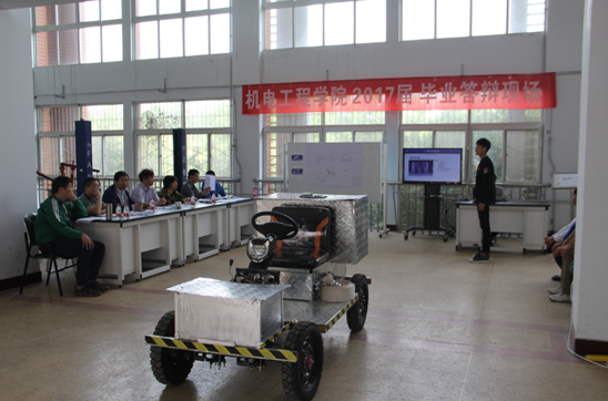 实物组的答辩过程分为三个环节,答辩人结合PPT先对自己的作品进行陈述,紧接着进行实物功能的演示,再由答辩组老师根据学生的作品提出问题,答辩人现场进行回答。这不仅考验了同学们对自己作品的熟悉程度和对专业知识的掌握程度,而且也考验了同学们的应变能力。最后,答辩组根据实物功能、学生的回答及表现进行打分并指出毕业作品存在的不足,给予优化意见。最后,李文星教授指导的“小型自动化蛇形弯管机”、贾蒙副教授指导的“大型振动筛动载荷实时监控技术的研究”、刘亚玲高工指导的“校园电动喷雾除霾车”等六组作品获得优秀等次。