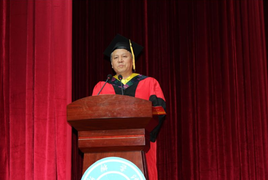 英国威廉集团院长李文星教授作毕业致辞,他勉励学生,不忘初心,方得始终,不堕青云志,梦想再启航,要保持学习,拒绝平庸,才能进步。