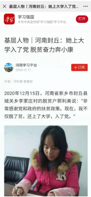如今,袁素芹儿媳妇郭利美家的房屋得到彻底改造,居住环境焕然一新,两个孩子成绩优秀,婆婆身体有所好转,丈夫收购粮食劲头十足。2019年10月,郭利美积极申请入党,如今已成为一名党员。郭利美说:“非常感谢党和政府的扶贫政策。现在,我不仅脱了贫,还上了大学,入了党。” 郭利美家脱贫的故事,还登上了学习强国平台。