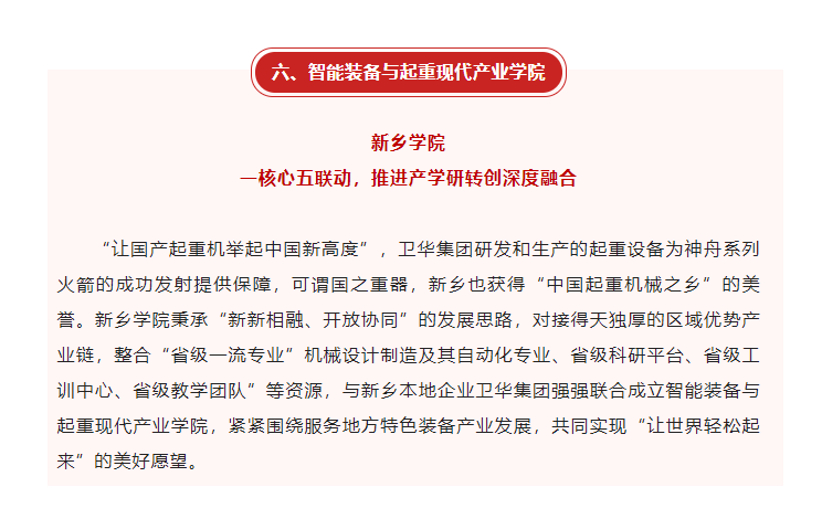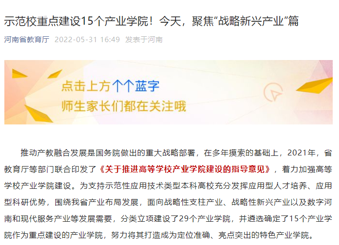 5月31日,河南省教育厅公众号推送了系列报道《示范校重点建设15个产业学院!今天,聚焦“战略新兴产业”篇》,对我校智能装备与起重现代产业学院坚持应用型高校办学定位,深化“新新相融、开放协同”办学特色,围绕省市产业布局发展,重点突出“一核心五联动,推进产学研转创深度融合”,积极探索校企协同育人,促进教育链、人才链与产业链、创新链的有效衔接等经验做法进行了深入报道。