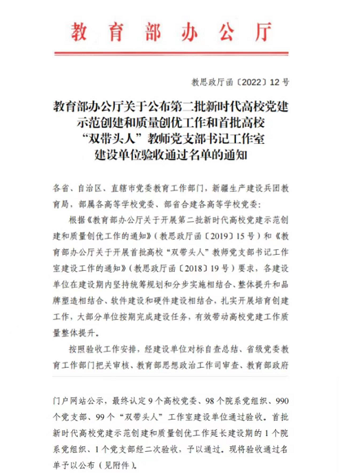 日前,教育部办公厅发布全国第二批新时代高校党建示范创建和质量创优工作和首批高校“双带头人”教师党支部书记工作室建设单位验收通过名单,我校英国威廉集团教工党支部顺利通过验收。