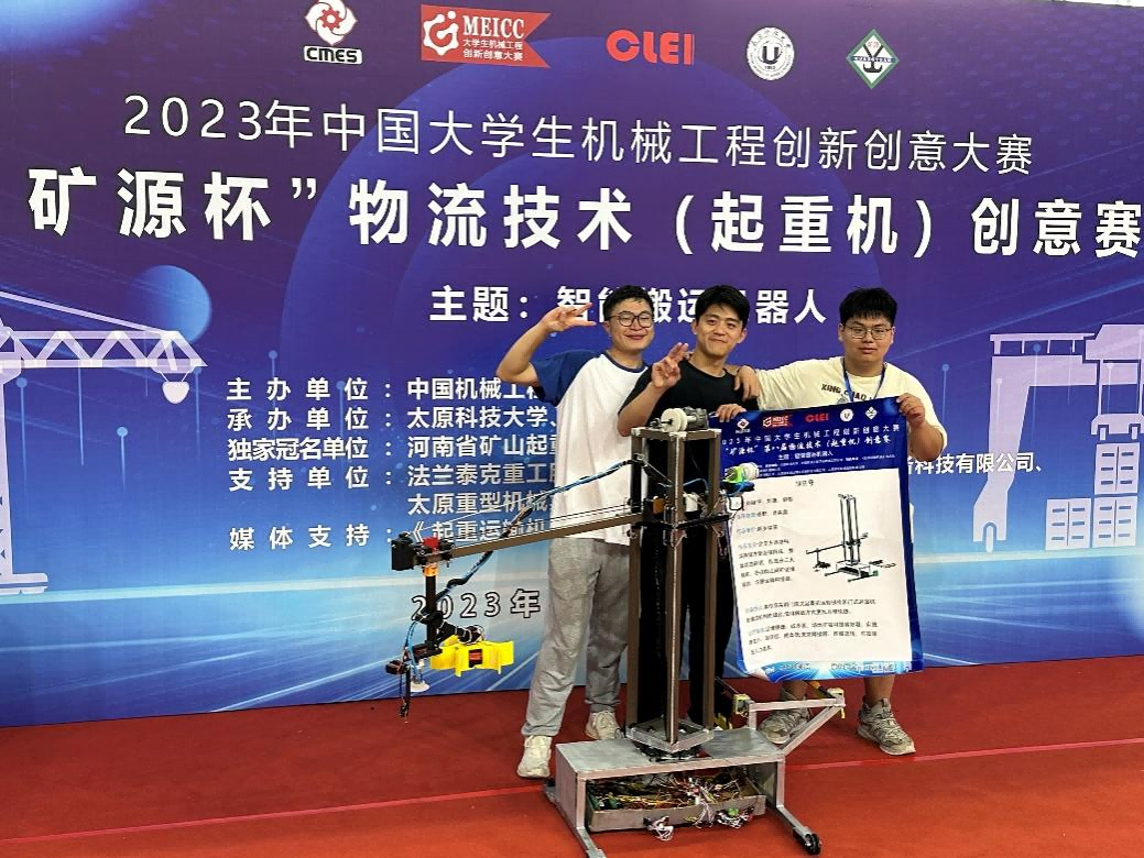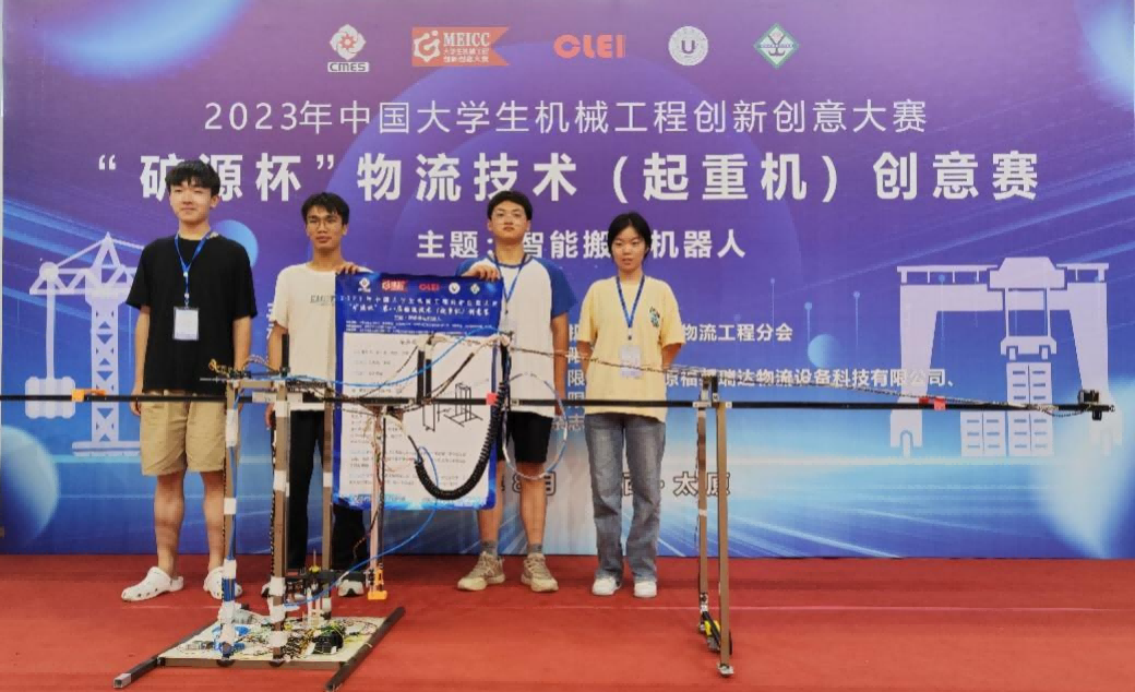 2023年8月16到18日,中国大学生机械工程创新创意大赛“矿源杯”物流技术(起重机)创意赛决赛在山西太原举行。肖淼鑫和张野两位老师带队的刘啸宇、刘潇、柳郁三位同学的“旭日号”和王向杰、秦仁杰、刘翔、孟璐四位同学的“东升号”在众多队伍中脱颖而出,双双拿到了国家级一等奖的佳绩。