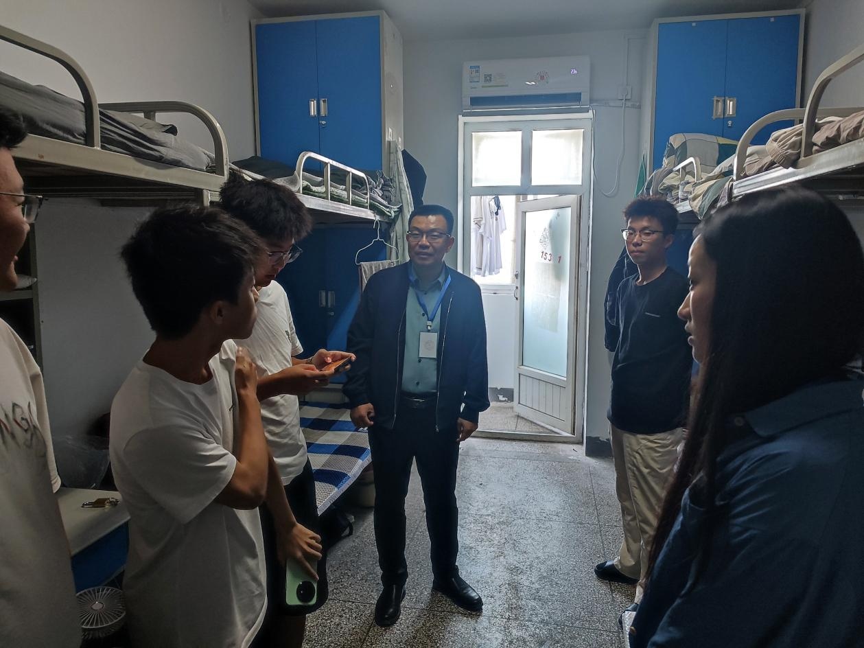 检查间隙,领导们与学生亲切交谈。“假期出行要避开高峰路段,保持通信畅通”“留校学习要合理规划时间,有困难随时找辅导员”,陈云飞详细询问学生的出行计划与生活需求,对家庭困难学生格外叮嘱关怀。