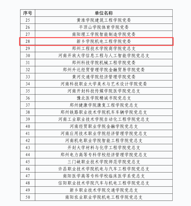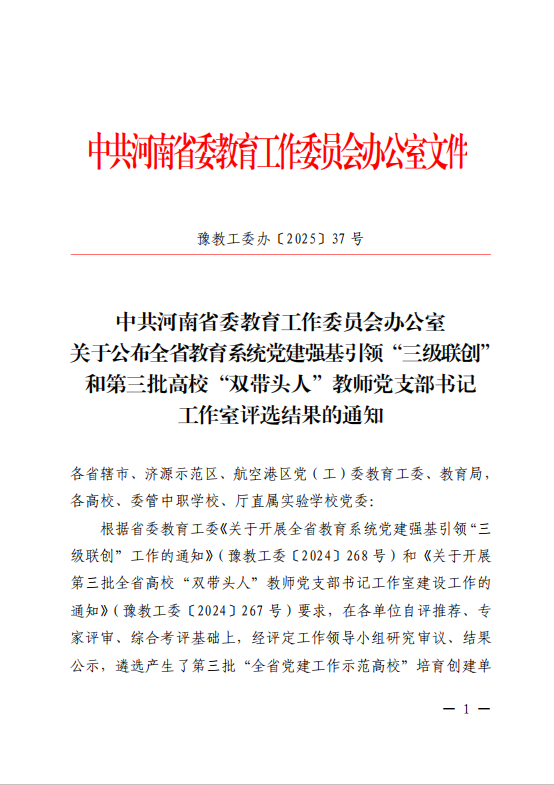 近日,中共河南省委教育工作委员会办公室印发《关于公布全省教育系统党建强基引领“三级联创”和第三批高校“双带头人”教师党支部书记工作室评选结果的通知》(豫教工委办〔2025〕37号),我院党委成功入选第三批“全省高校党建工作标杆院系”培育创建单位。