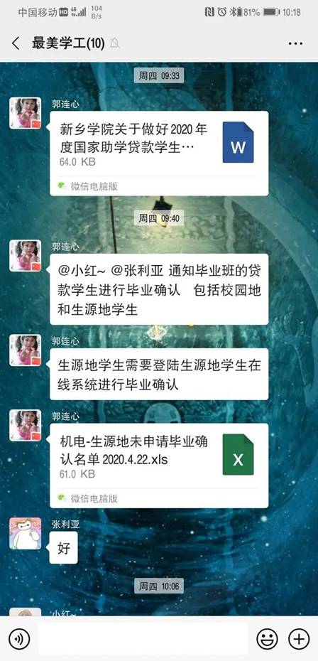 “伟大出自平凡,英雄来自人民。”疫情尚未结束,他们的工作也从未松懈,认真落实好毕业班贷款学生的毕业确认工作,充分运用了现有的网络平台进行直播教学,在超星学习通章节中上传自己录制的教学视频,使用中国慕课等网络精品课程资源作为教学资料等多种方式,给学生创造丰富多彩、高效高质的课堂。他们通过语音、打电话了解同学们的健康状况和出行状态,提醒同学们认真填写“今日校园”个人健康日报信息,做好心理疏导,建立每个学生的台账。他们叮嘱同学们做好个人防护,提醒学生不信谣不传谣、减少病毒传播机会、提高防护意识,以自己的实际行动积极遏制疫情扩散。