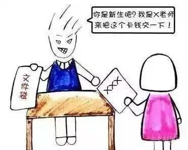 新生入学时可能会有骗子冒充本校老师或领导,进入教室收取班费、资料费等各种名目的费用。或假装学长学姐,推销商品、办劣质校园卡、引诱萌新报补习班等。
