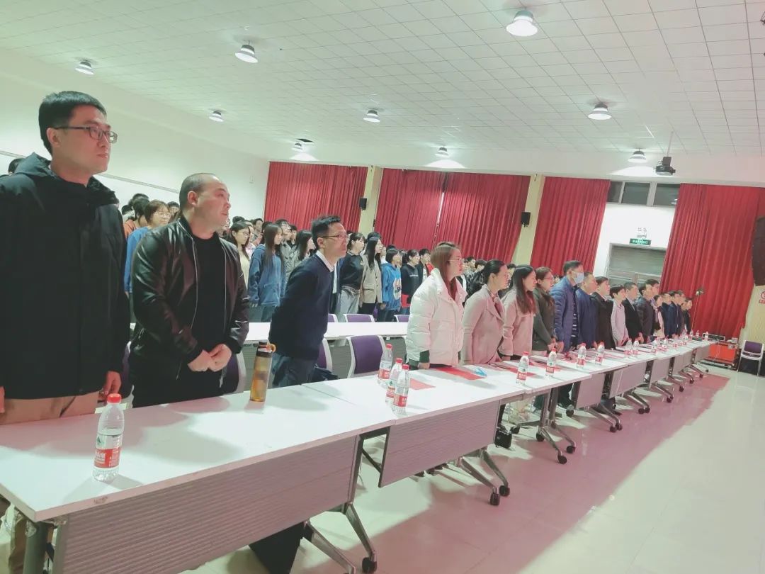 会议结束,全体师生起立,奏唱校歌《牧野鹰扬》。