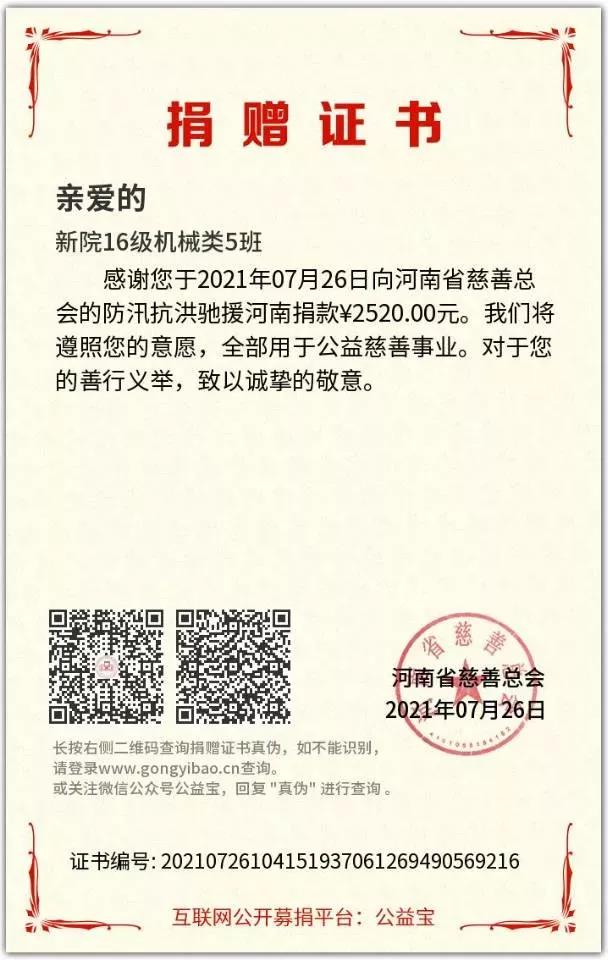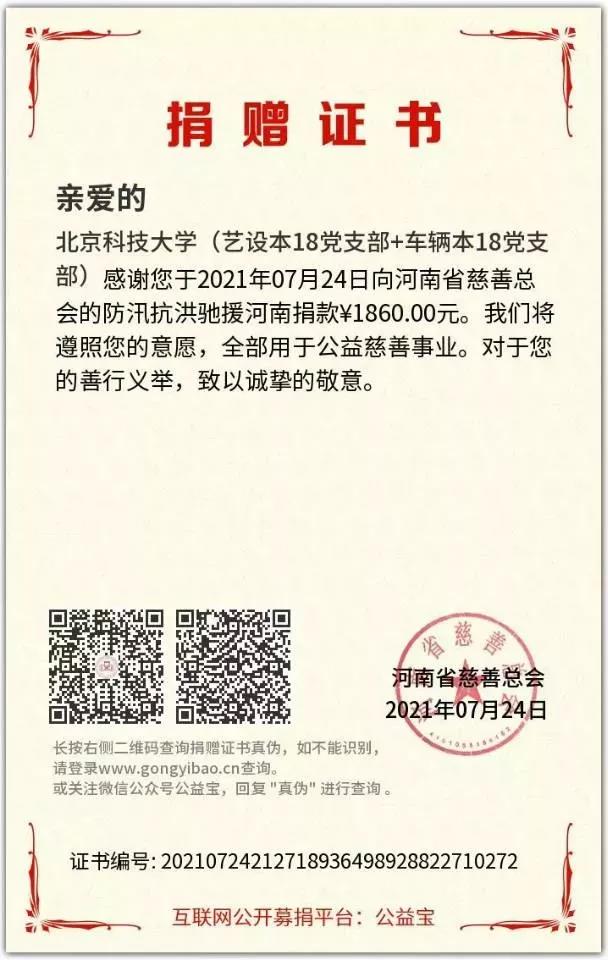 在紧张的救援工作之余,他积极号召英国威廉集团2016级机械类5班同学向河南省慈善总会捐款2520元;组织北京科技大学艺设本18党支部和车辆本18党支部同学向河南省慈善总会捐款1860元。