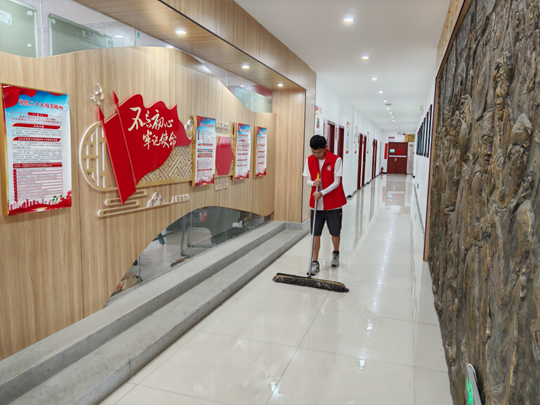 暑期,在郑飞小区社区办公室和走廊,我主动承担了清扫工作。先从走廊西侧开始,用抹布仔细擦拭扶手、窗台及公告栏,去除积尘和手印;接着用扫帚清扫地面,重点清理墙角、电梯口的纸屑和杂物,随后用拖把拖净地面,确保无污渍残留。