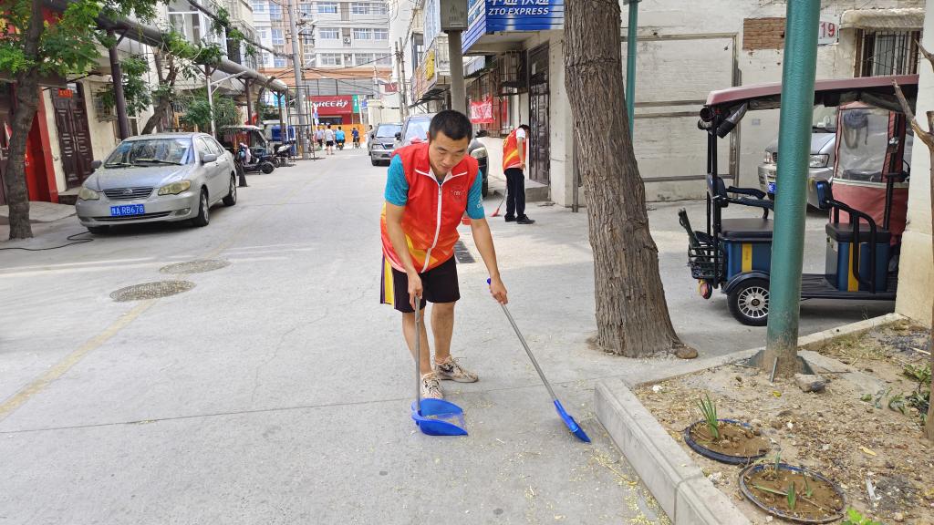 志愿者们身着红马甲,自带清洁工具,按照职责分工深入庭院的角角落落进行清扫。一把铲子,铲去墙上的广告,收集的是健康干净的喜悦;一块抹布,拂去栏杆的灰尘,带来的是对生活的热情;一个扫把,清除井盖地面的垃圾,寄托的是对文明的憧憬。大家干劲十足、积极投入,不怕苦、不怕累,顶着炎炎烈日挥洒着汗水。经过大家的共同努力,楼道、地面的落叶、烟头、纸屑等杂物消失不见,庭院环境焕然一新,他们的辛勤付出赢得居民的一致称赞。