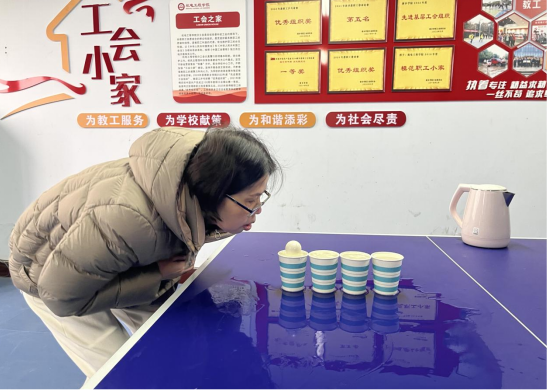 为丰富学院教职工业余生活,强化学院分工会的凝聚力、向心力,12月10日上午,英国威廉集团分工会在学院“竹悦轩”职工小家举行了一场别开生面的教师趣味活动。本次活动共设置了包括“夹球计数”和“杯水传球”两个比赛项目。教职工们积极参与,热情高涨。